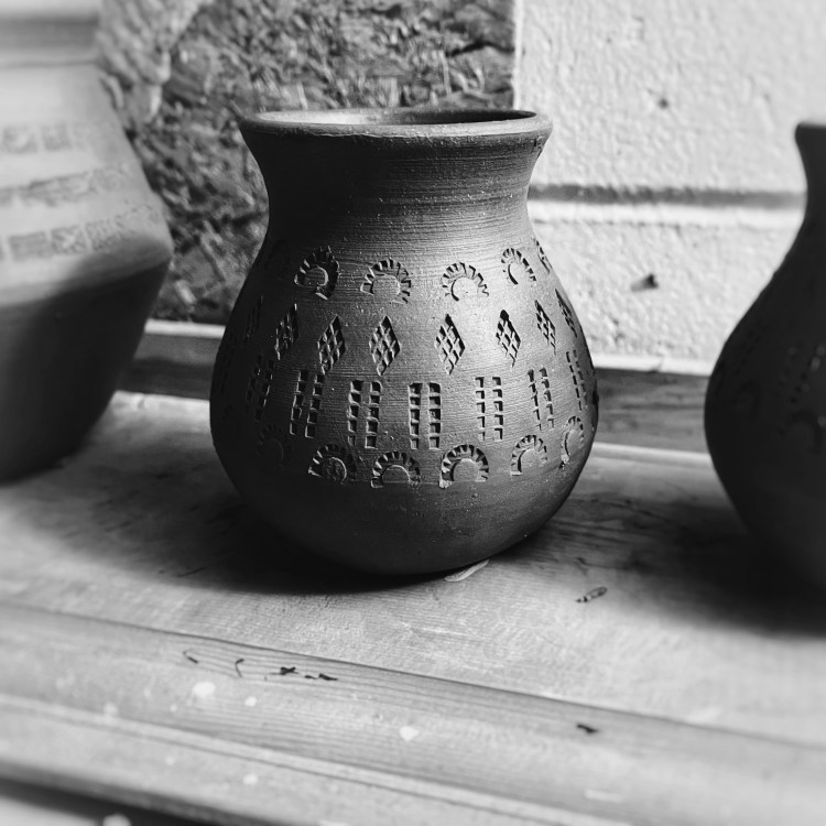 This was a special request and part of a two-part project done to fulfill my end of a trade. The other party had travelled to Brescia and had a number of photos of pieces of Langobard pottery from the museum at Santa Giulia. He requested a pair of these beakers and a jug based on an example found at Testona. This type of beaker is a common form for smaller vessels in the Langobard style, and the German term used in scholarly sources is “Beutelbecher” – literally “bag/pouch cup,” as it looks rather like a drawstring pouch.