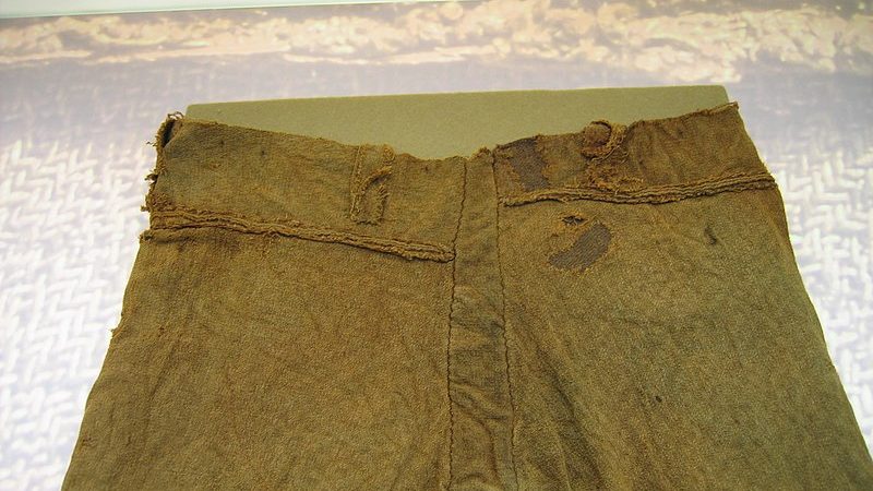 Speaking of the waistband and top edge, your trouser pattern should now have a top edge that reaches your natural waist (if it goes above, that’s fine too). When worn, you’ll have some sort of belt right at that point, and the wide waistbands on the Damendorf and Thorsberg trousers may have been folded down over a belt (the waistband seam on the Thorsberg trousers is “wrong side out,” so it may have been meant to be the underside – see image below). I place that seam right at my natural waist so that the waistband folds over to cover the belt or tie. The shirtless Germanii on Trajan’s Column don’t wear pants that do this, but their trousers appear to be more similar to the Marx-Etzel breeches (likely from around the same time) rather than the Damendorf and Thorsberg examples that are probably a few hundred years later.