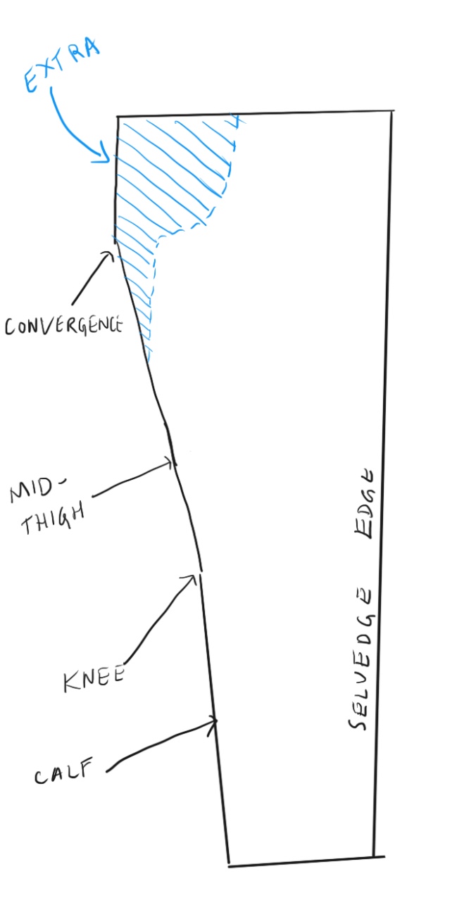 Starting with a large piece of fabric that is long enough to go from your ankle to your bellybutton, drape a tube around you with a straight or selvedge edge running up the center back of the leg to a point above the natural waist. This should run up the back of your buttcheek, probably a little bit outboard of the midline of the buttock (think about the midline of the pocket of your jeans instead). This selvedge edge is meant to be a fixed line, so you want to bring the opposing edge of the leg tube to meet it. Holding the top edge of the fabric parallel to the floor, wrap the fabric to where it meets that selvedge edge at mid-thigh and pin this point. Flex the leg, making sure your thigh has enough room still, and pin at the knee and calf as well, keeping the selvedge straight up and down and bringing the fabric from the other side in to meet it.