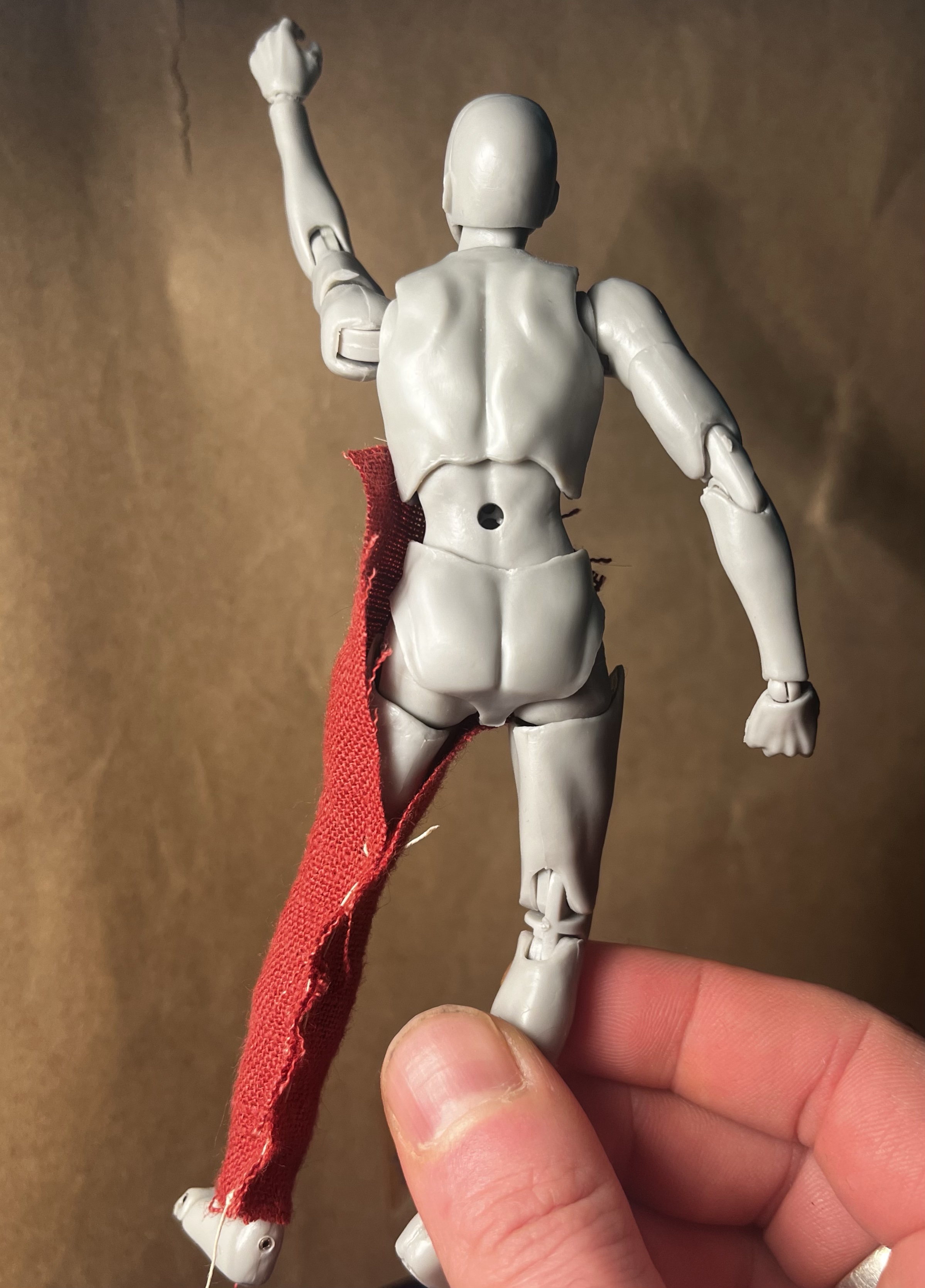 As you cut the following pieces, make sure to add in a generous seam allowance. Taking care that the upper part of your leg tubes is still more or less on that same line just outside the midline of your buttcheeks, hold some fabric up to your ass. Find the widest part of your rump and at that point, pinch or pin one edge of your fabric together with the selvedge edge of the leg tube; lay it across your behind (without stretching it) to find a rectangle that easily covers the remaining space across your ass and that is at long enough for the center of the bottom edge to reach the crotch seam junction on your jeans while the top edge is even with where the top edge of your leg tubes hits (see blue shaded area in photo below; luckily my willing model is injection molded and has a convenient seam in his plastic to mark his root chakra).
