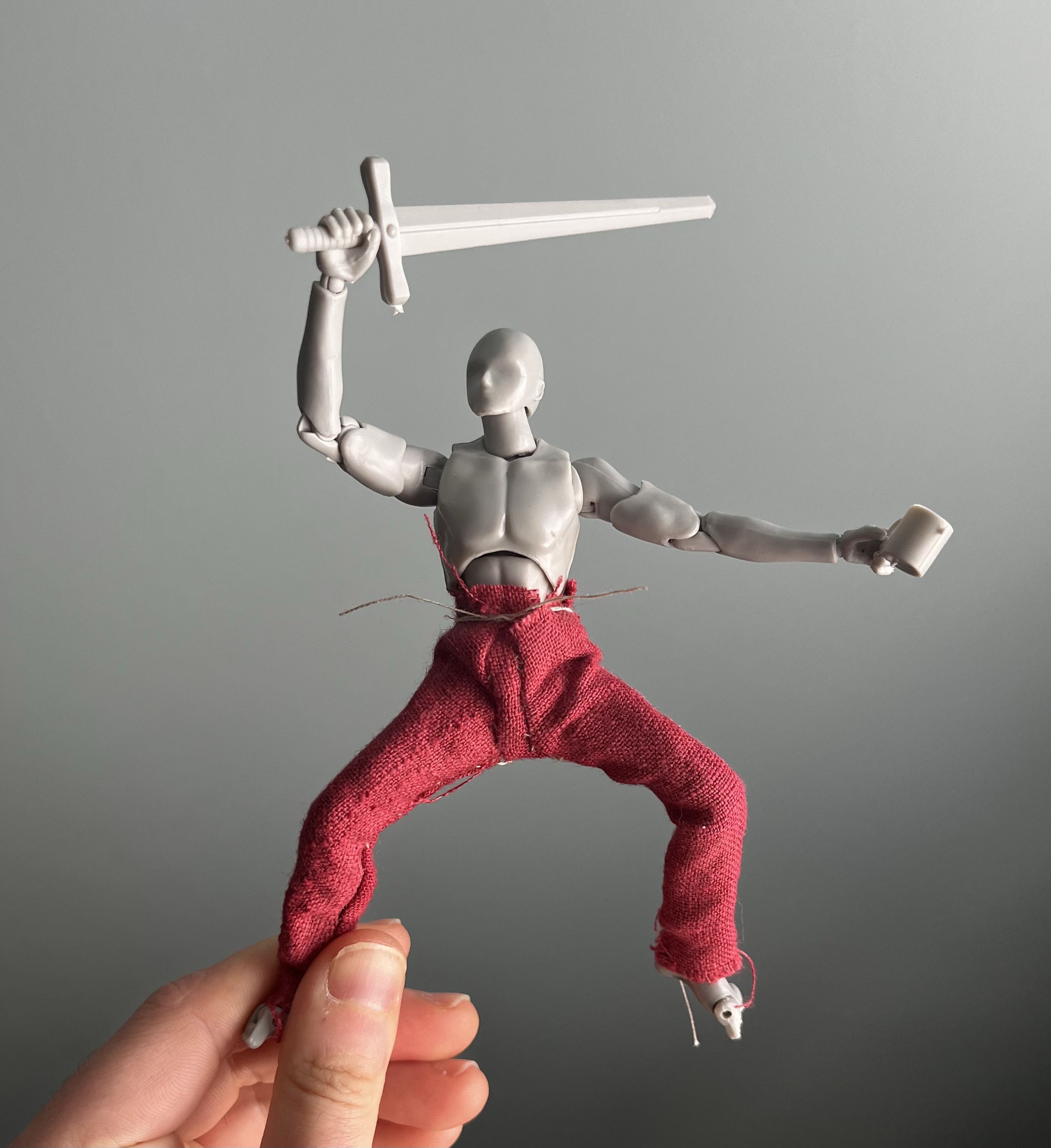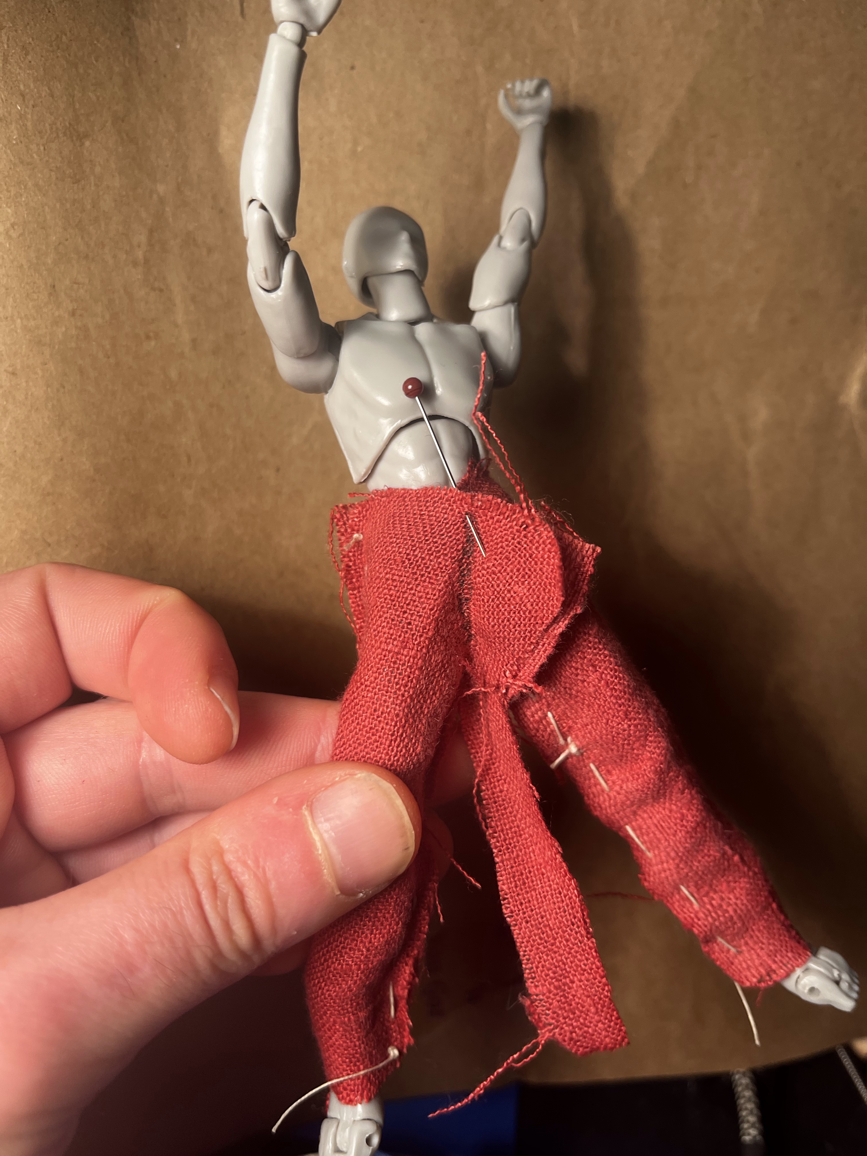 I made some pants last week and someone asked me how I did it. What follows is my attempt to explain a process that involved me squatting in my underwear and looking rather foolish at times, but allowed me to make probably the best-fitting trousers I own without using any math. Why on earth would I do this? Finds of Iron Age trousers show that the garments were not perfectly symmetrical, and although it is possible to derive a well-fitting pattern by taking body measurements and doing math, Iron Age clothing makers likely relied on experience and proportion rather than numbers, and some of the historical patterns are most easily achieved by simply draping fabric on the wearer’s body. I wanted to see how that might have worked. So if you are feeling intrepid and want to make some late Iron Age trousers without modern conveniences like rulers, French curves, tape measures, or paper patterns, here is how I do it. I cannot guarantee this is how it was done in 400 CE but this method will work if you are illiterate, have no system of absolute measurement, and have nothing more than a pair of shears, a needle and thread, and six or eight pins or fish bones. The trousers fit like a second skin when seated, stretch enough to squat or crouch, and have a touch of ease when standing. There is no math involved, just draping, pinning, and a bit of basting. Having a friend on hand may be good, especially if you have limited mobility or balance issues, but I have not had any difficulty making my own trousers as a solo endeavor, even though my flexibility and proprioception are not extraordinary.