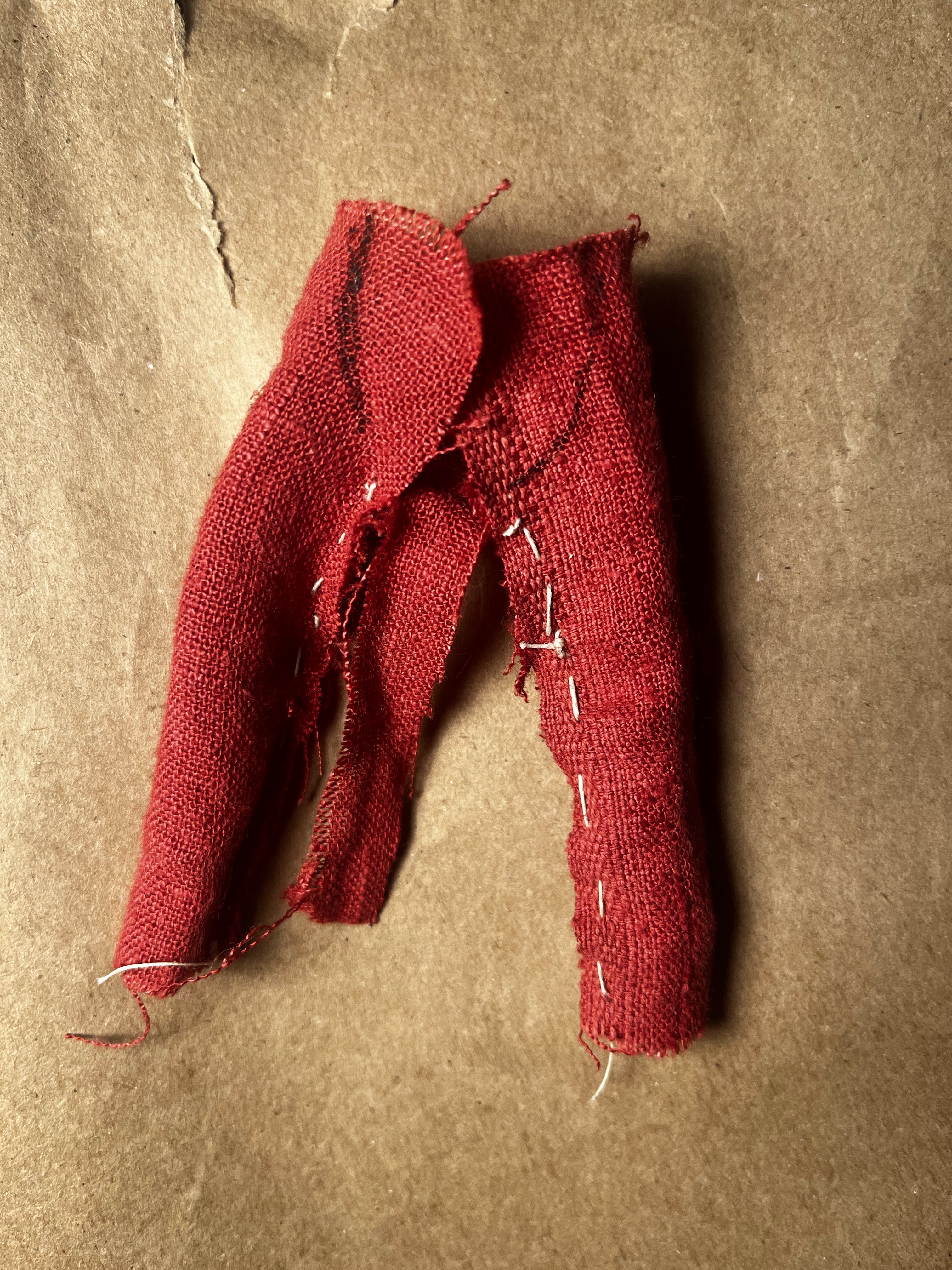 Congratulations, that’s your leg tube. Baste the seam you just pinned up the back of the leg to mid thigh. Cut it out from the piece of fabric, leaving it a little oversize just to be safe if you want. Repeat the process on the other leg. You should end up with something like this:
