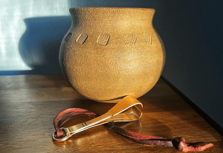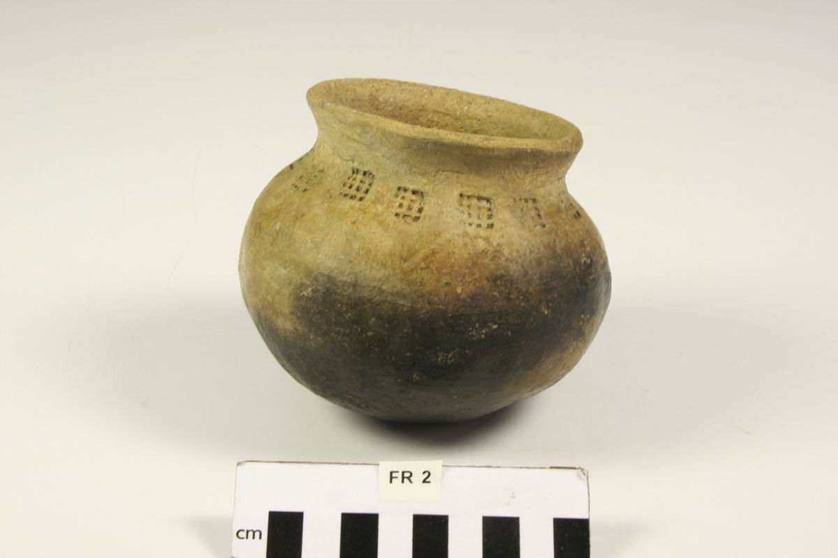 I also wanted a drinking vessel of some sort. Luckily, I’m a potter so I can make whatever I want. The little cup is based on examples of Frisian ball pots decorated with a single row of very simple grid stamps, like these two from the collection of the Rijksmuseum van Oudheden. Both were found in terpen in the province of Groningen; the one on the right was found at Westeremden, the one on the left at Farmsum. They have very round bottoms and an everted rim and fit very comfortably in the hand.