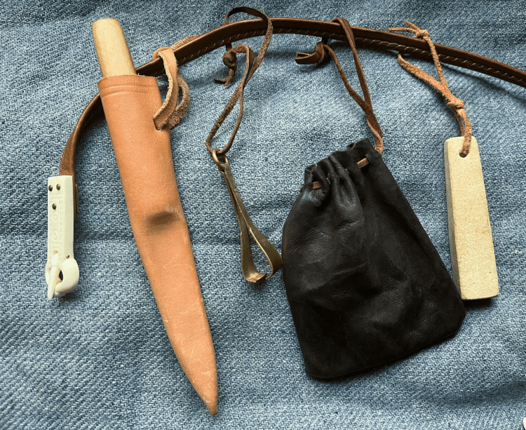 The simple rectangular purse is loosely derived from a Haithabu find (as is the whetstone, which was purchased years ago from a source I have since forgotten). Made of very thin goatskin, the purse seams are whipstitched on the flesh side and the whole thing was then turned right-side-out. It is about the size of my palm, (9cm x 12cm) and is a discreet spot for a drivers license, single car key, and a bank card or a bit of cash, but is also a good place to put a dozen replica coins, a lucky bead, dice, or other small historically accurate items. In a living history context, I am a firm believer in eliminating unnecessary modern intrusions rather than finding “historically-inspired” ways to accommodate my phone.