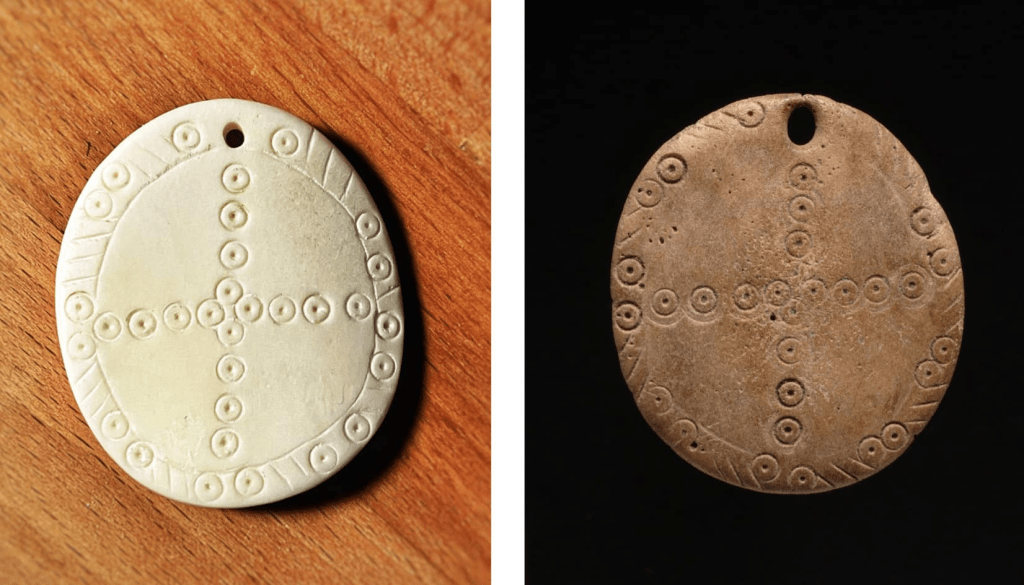 The decorated disc is less ambiguous and was almost certainly a pendant of some sort. The original was found at Dorestad and is dated 750-900 CE. It is about 1.5” in diameter, and I opted to make mine slightly crooked in imitation of the real thing. If you look closely at the museum example, you can also see that there are two different ring-and-dots; the arms of the cross are done with a double ring, and the outer ring is very faint, while the border is a single ring—I only had one auger small enough so I used the single ring throughout.