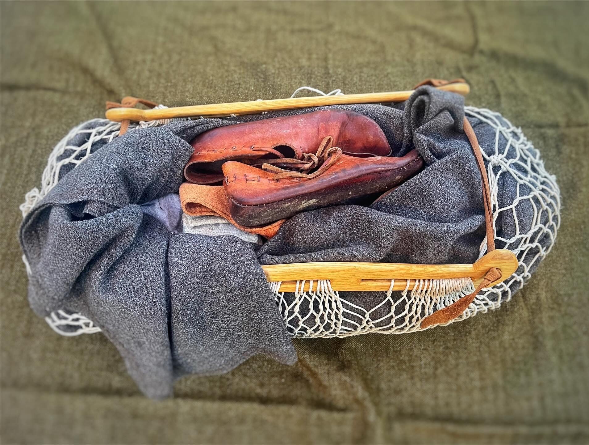 For a more permanent strap, I wanted something that was narrow enough at the ends to pass through the handle holes but wide enough in the middle to not dig into the shoulder under a heavier load. While I could have cut a single tapered strap that would achieve this, instead I used three small scraps attached using a join found on other leather fragments from Haithabu (Groenman van Waateringe 1984, pl. 19). All told, I think the final product works well, and aside from the nearly 100m of twine required for the sprang, requires minimal materials, little skill, and takes up very little space when not in use.