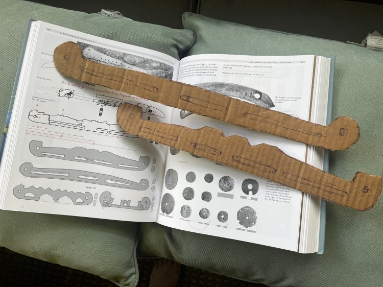 The handles are replicas of the longest example of a bag handle found at Haithabu (HbH.119.014; measures 49.6 cm in length). Of the ten wooden handles from Haithabu, half are carved from maple and half from ash (Westphal 2006: 80), and since I had a nice piece of ash on hand already, that’s what I used. To ensure that the shape and dimensions were accurate, I enlarged the published drawing to full scale and transferred it to a cardboard template.