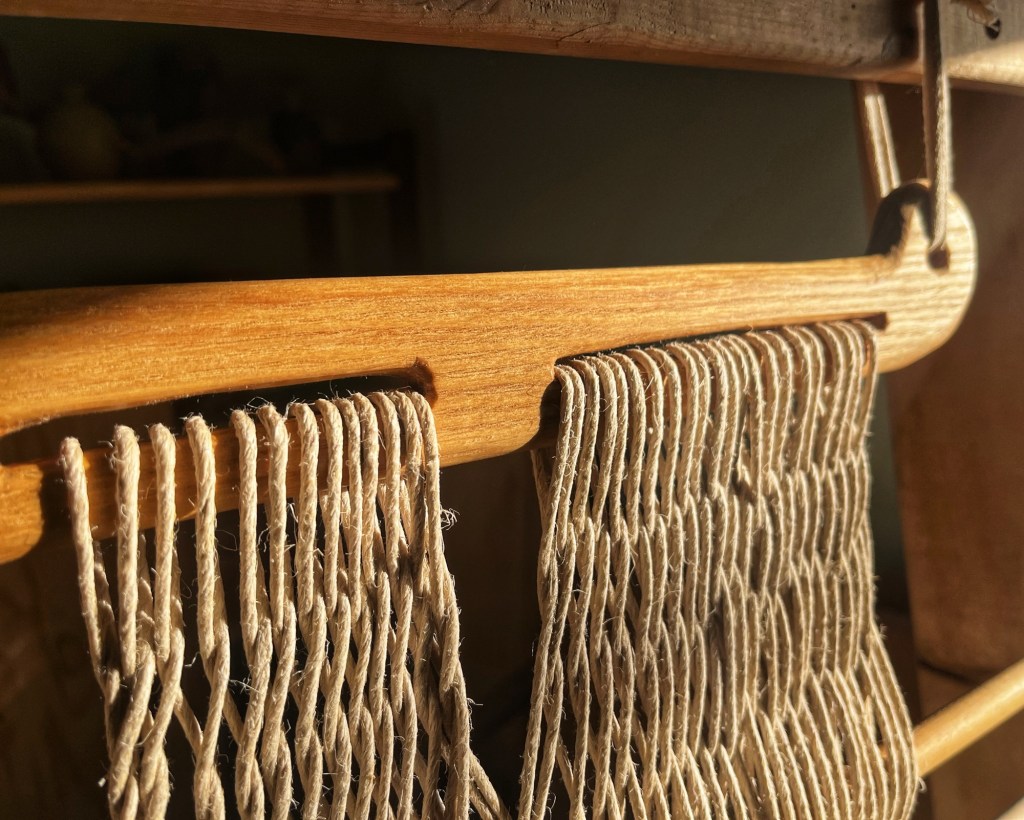 The fragments of preserved sprang were not enough for me to draw any useful conclusions about the pattern, and the two large Haithabu handles did not have any preserved textile anyway. I had no prior experience with making sprang, but it turns out that a basic interlink (one warp forward, one warp back, offset on alternating rows) is fast, easy, and nice and stretchy. I did a few test bits with scrap yarn to learn the technique and then set to work on the real thing. If I lived in a post-and-beam building, I would likely have hung one handle from a beam and attached the other to a weight on the floor. Instead, I built a rectangular frame out of some lumber in my garage and attached my handles to the upper and lower crosspieces using twine (at left, below), which quickly snapped under tension, and then some sturdier twill tape, which worked well. I warped up with 2.5mm plied hemp twine, leaving about 80cm of warp length between the two handles. The wider slots on either side each received 22 wraps, for a total of 44 warp threads (22 front, 22 back), and the center one got 12 wraps (initially 13, which I discovered after the math didn’t work on the first few passes–oops) for 24 warp threads. Continuous warping of all three slots was not viable, since it created an awkward diagonal warp, so instead each slot is warped as its own separate system. I also needed to figure out how to span that gap in the sprang without adding excess strain. After a little bit of trial, I decided to do the first row of sprang in each system separately and then connect all three systems starting with the second row.