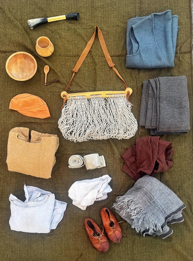 The biggest question in my mind was how spacious the finished project would actually be. I dragged out a heap of my Viking Age kit and decided to find out. The one obvious downside to the netting approach is that small items will fall out if thrown in there loosely. The contents are also not protected from the elements or from impact. My solution was to treat the whole thing like a tidier and more versatile equivalent of bundling everything up in a cloak or blanket. I took a heavy cloak measuring 2m x 1m, folded it in half to create a 1m square, and stuffed it into the bag. I then loaded everything else inside so that the cloak tucks around all the other items. It would be easy enough to just wrap small or fragile items together in a spare tunic or even a scrap of fabric, but the cloak-wrapped method would also have helped keep the contents dry in a drizzle.