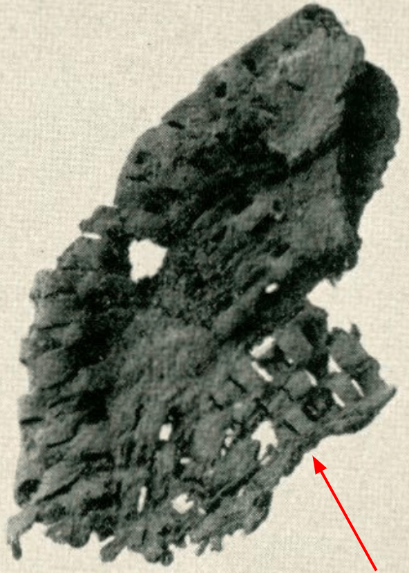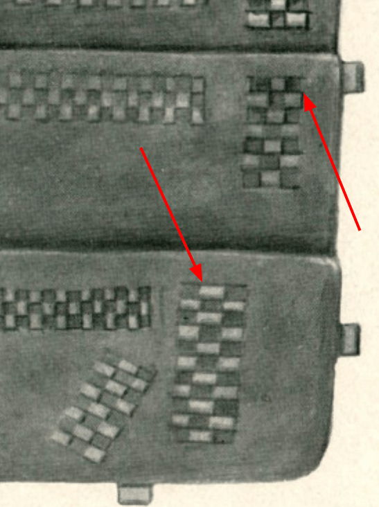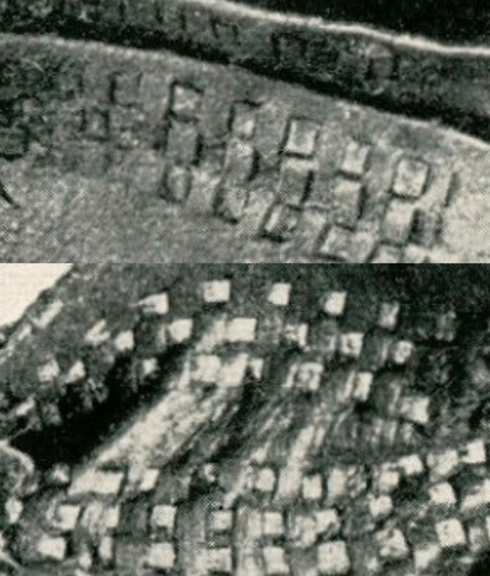 When compared to the photographs of the actual piece, these details seem to be a matter of artistic convenience rather than a careful depiction of the object itself. In examining a photograph of the same corner of the piece taken in the 1930s and published in the same volume (see Fig. 3), the continuous perpendicular horizontal lines are noticeably absent; while this could be attributed to the warping of the leather surface as it conforms to the woven thongs in this area, examination of the photograph did not show this detail anywhere. Secondly, the photographs show that the individual thongs are separated by a small gap – perhaps a millimeter wide – and are not as closely spaced as the drawing indicates. Again, this could be attributed to shrinkage (if the gilded strips shrank at a different rate than the surrounding material), but if that were the case, one would expect to see gaps on either side of the strips.