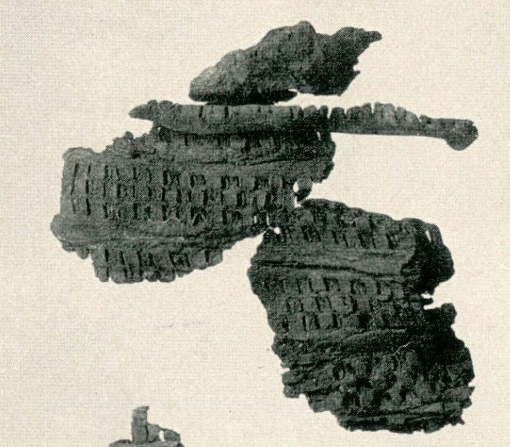 The pouches in Bj. 904 and 543 also belong to the wallet type without a doubt. The latter has a print of gold stripes on the undecorated side (plate 133b), which could indicate that it was folded up. Furthermore I count among this group – with express reservation because of the extremely fragmentary character of the leather – all fragments that have the characteristic decoration with incisions and gilded leather stripes. The following graves contain leather fragments, which may therefore be remnants of wallet-type bags: Bj. 523, 709, 710, 715, 717, 746, 804, 837, 845, 956, 965, 1037, 1149: this also applies to the graves mentioned in Birka 1 with leather fragments with incisions, which fragments have meanwhile been lost: Bj. 503, 724, 731, 834. The leather fragments from Bj. 727, 776 and 808, which have no incisions, but have gilded leather strips, probably belong here also.