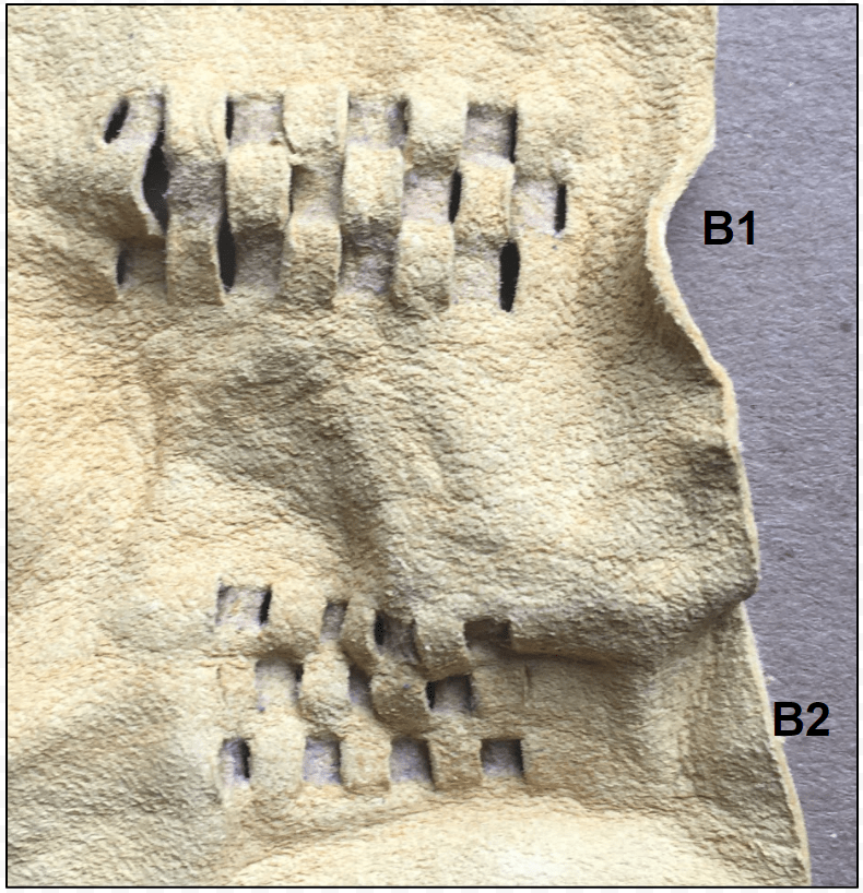 The final example in this brief survey is the comb case from Bj. 1074 (Fig. 15). The comb case appears to have been executed with slightly less minute accuracy than many of the purses, and the impressions made by the decorative stripsare somewhat narrower in relation to the slits – whether this reflects the makers intent or is the result of degradation after burial is unclear. In this example, the upper half displays wider margins between the adjacent strips – exceeding 50% of the width of the slits in some areas, although still reasonably well aligned to form the checkerboard pattern. The margins between strips clearly show that individual slits were used for each strip.
