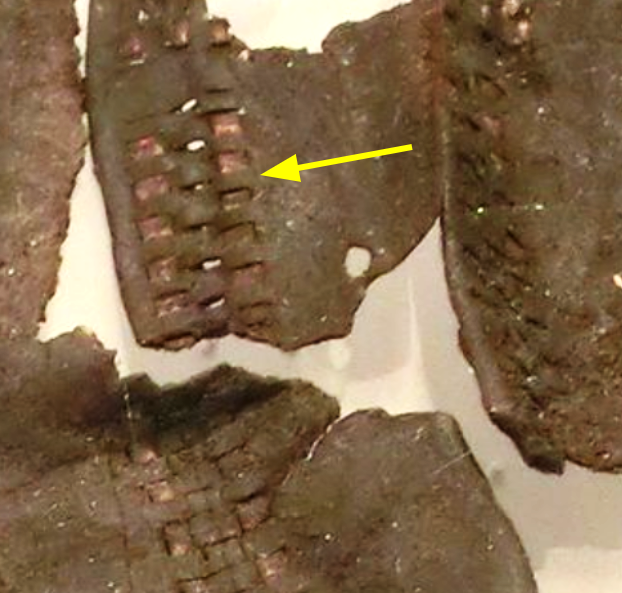 Returning to the photographs of the original piece, I began to look for additional details. The basketweave method clearly produced a result consistent with the drawing, but did not seem to represent the alignment and wear patterns visible in several of the published photographs. Upon closer inspection of a recent photograph taken at the Historiska Museet, a fragment of one of the lower pockets offered a useful bit of information. On this piece (the upper right corner of the second-lowest pocket, the same area shown in Fig. 3), the middle strand of gilded leather has been lost and the holes are clearly visible (see Fig. 7). While most other areas of decoration are fairly consistently spaced, in the detail at left, the incisions for the middle strip are actually slightly offset from those on either side.