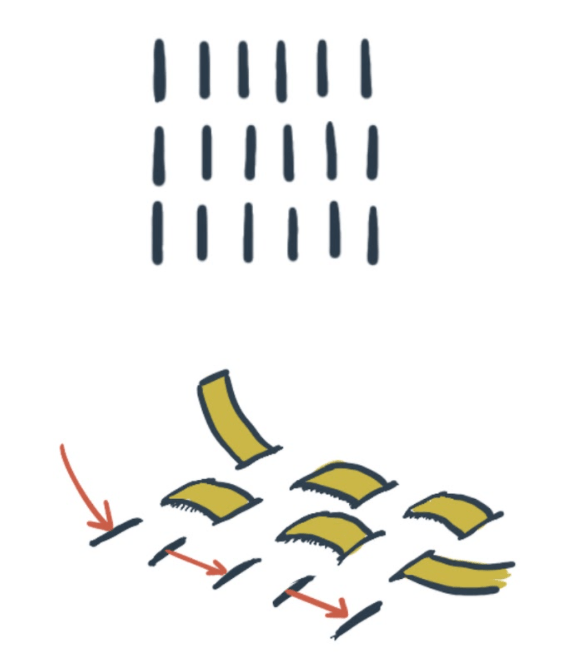 The basic decorative element repeated across the surface of the purse – and found on more than a dozen other similar objects at Birka – comprises three parallel strips of gilded leather drawn through slits cut in the main body. At first glance, the illustration seems to be a clearer depiction of a technique rendered difficult to see in photographs of the crumpled leather of the purse. Examining the illustration closely (see Fig. 2), one can quite easily discern continuous horizontal lines that span the width of each decorative stripe, implying a continuous slit through which all three strips are drawn in an alternating fashion. The image also presents an extremely regular checkerboard pattern throughout each stripe and shows no gap between the parallel strips.