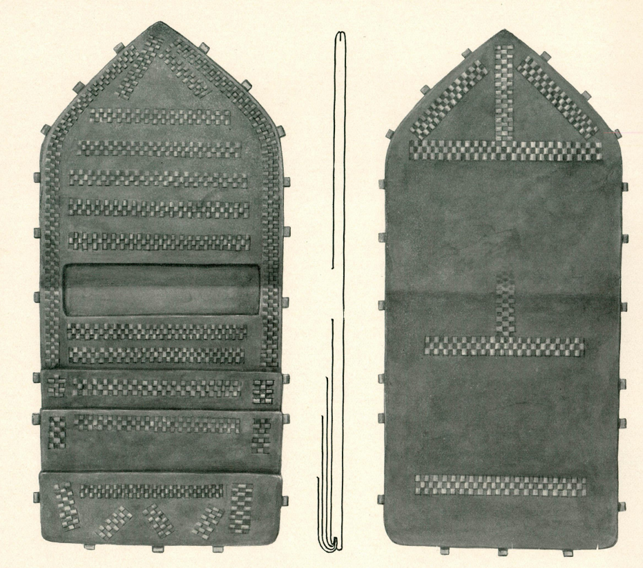 At the corner of the chamber lay a second leather pouch rolled up, about 20 cm long and 10-11 cm wide, only about half preserved, the pouch consists of a piece of leather on which five other pieces are sewn as compartments in such a way that that one compartment is on one side of the center, four are on the other side, both parts decorated with gilded leather straps drawn through rows of cuts, around the edge small gilded leather eyelets.