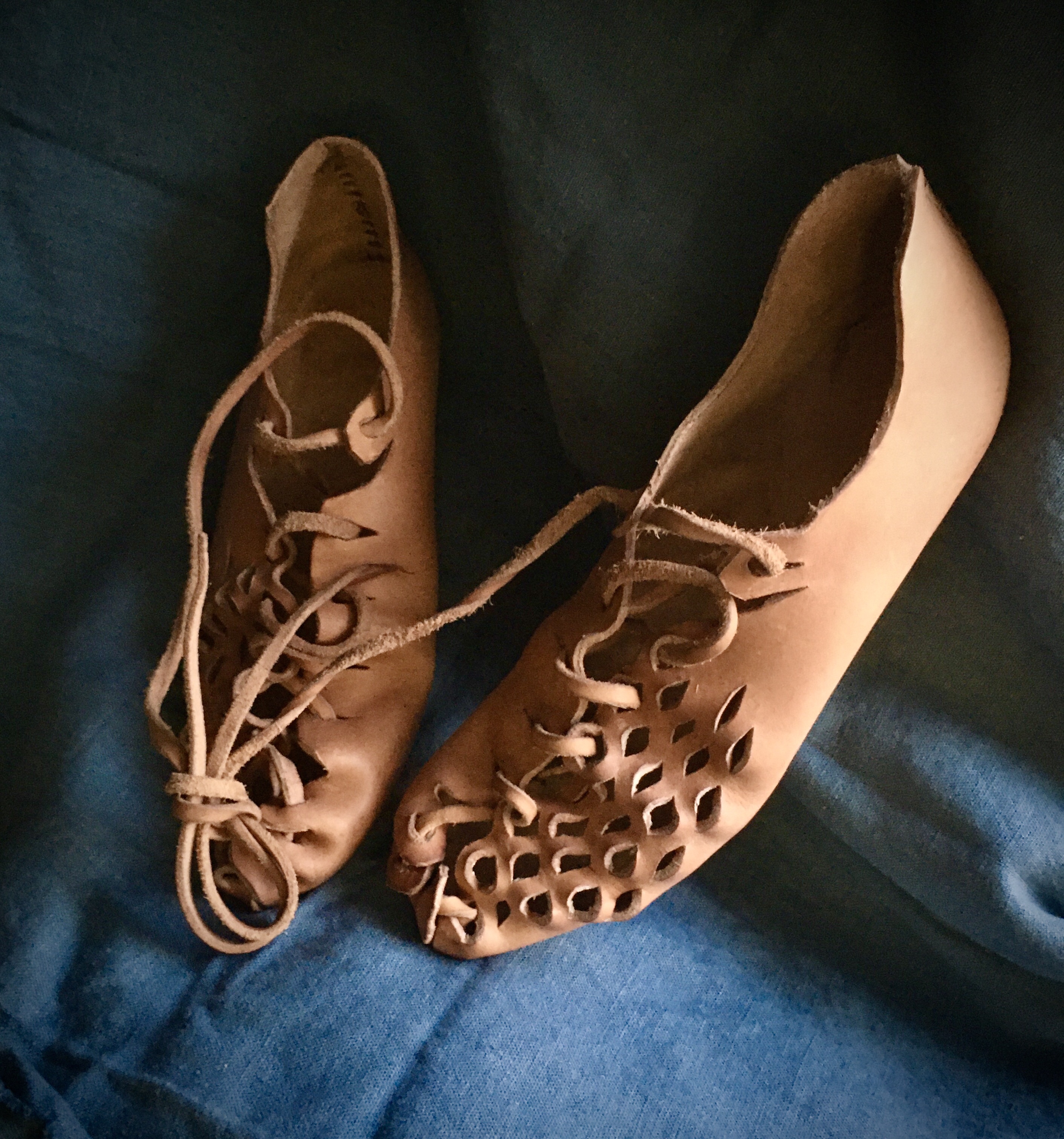 We don’t know what the period term for these was, but today they’re sometimes referred using the Latin term for the comparable Roman style known as “carbatinae.” Some examples, particularly those associated with Germanic-speaking groups from beyond the Roman frontier, are asymmetrical with the laces closer to inside edge of the foot rather than straight down the middle. For comparison, you can take a look at a pair of the symmetrical Roman type found with a group of 4th century CE items deposited in a bog in Deurne, Netherlands (click here – see p. 310) .