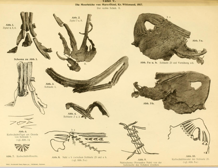An example of the first type with the “petal” toe is shown below. Dated to the 1st or early 2nd century CE, the Marx-Etzel shoe was found in a bog in northern Germany in 1817 and published in 1907 (click here for the original publication). The images from that publication show the decorative details and stitching techniques (see pages at right), and I’ve enlarged the diagram to show the cutting pattern as well. Similar shoes show up in many other locations in northern Germany and Denmark in the early centuries of the first millennium CE. The body of a man who died between 260 and 380 CE in Obenaltendorf (Lower Saxony) was wearing a very similar pair (image at the bottom).