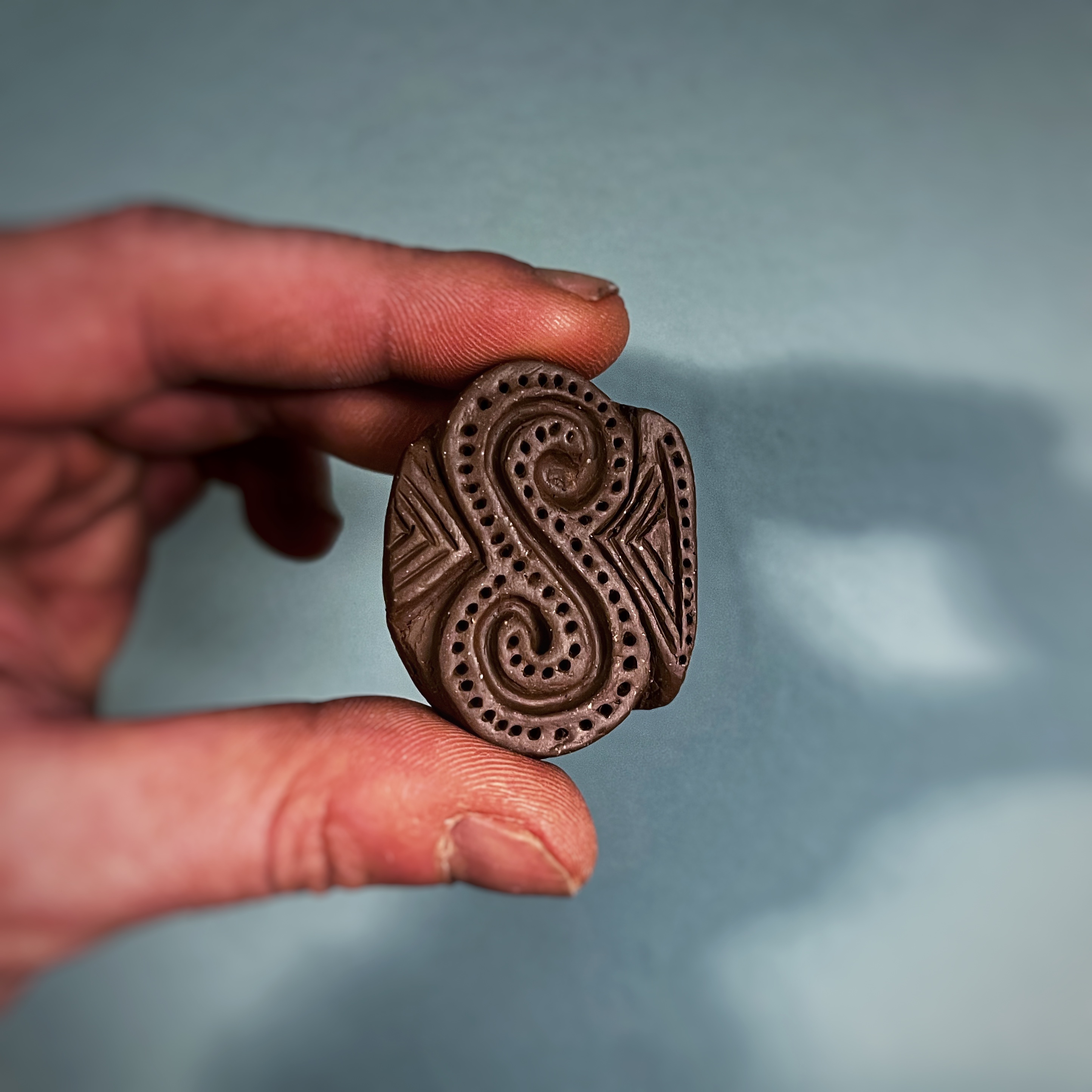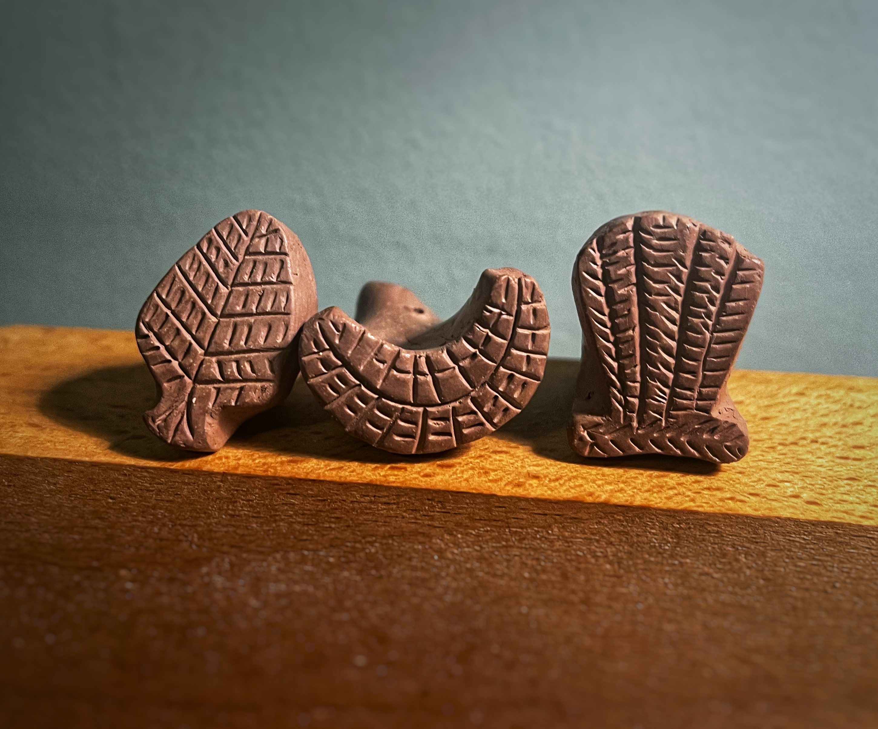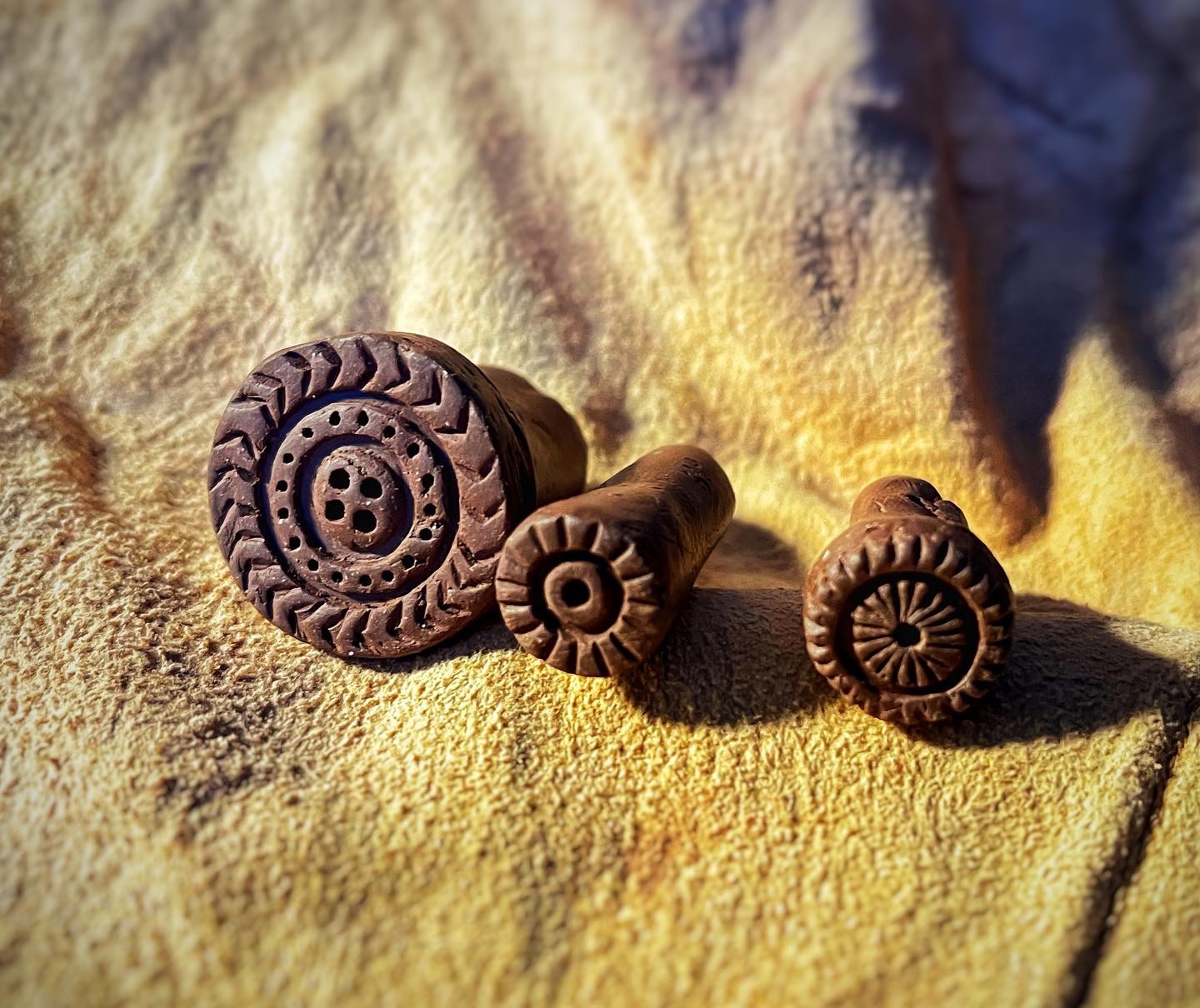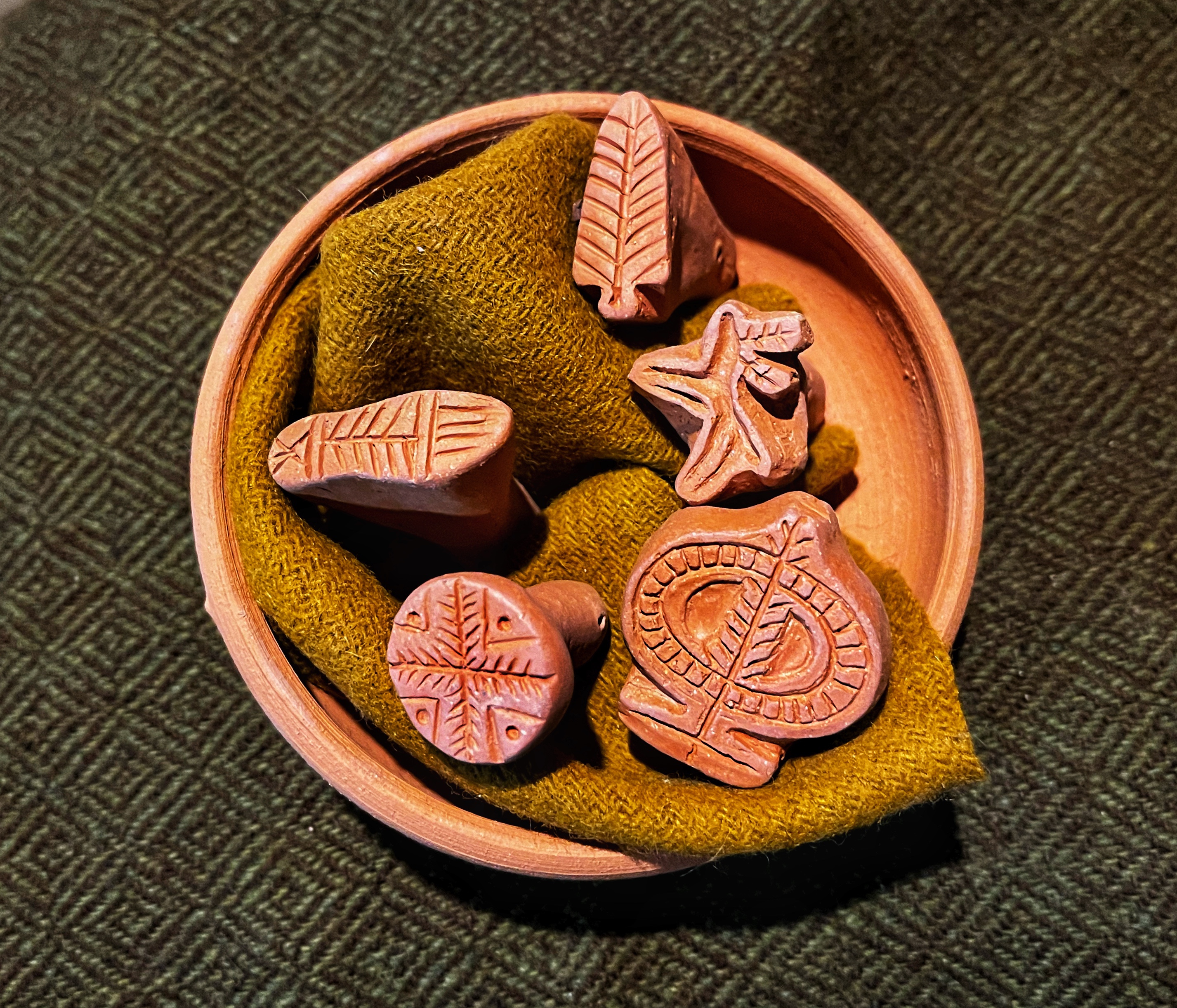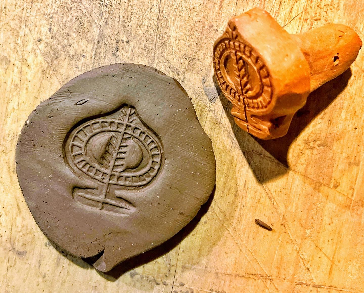 There are multiple surviving examples of the stamp dies themselves (see below). These are generally of unglazed earthenware and have the design carved into one end with a short handle formed at the other end. I make mine by forming the rough shape from wet clay, then waiting for it to partially dry to a “leather-hard” consistency before carving the end into shape with a small knife and using pointed bone and metal tools to cut or impress the details.