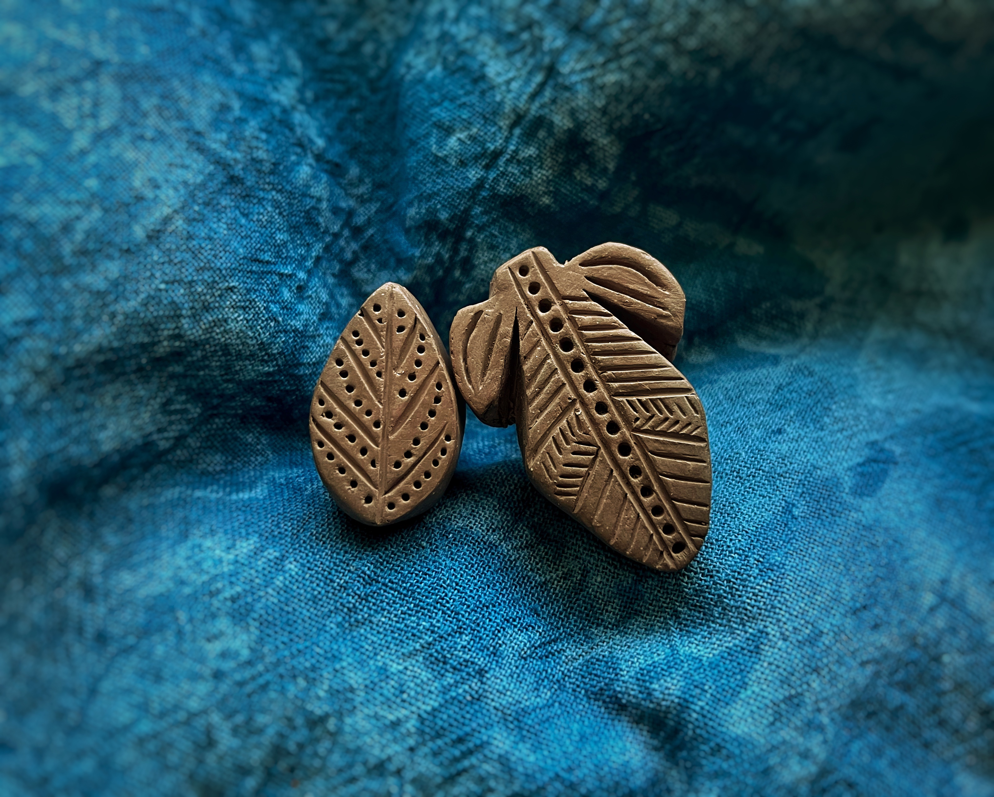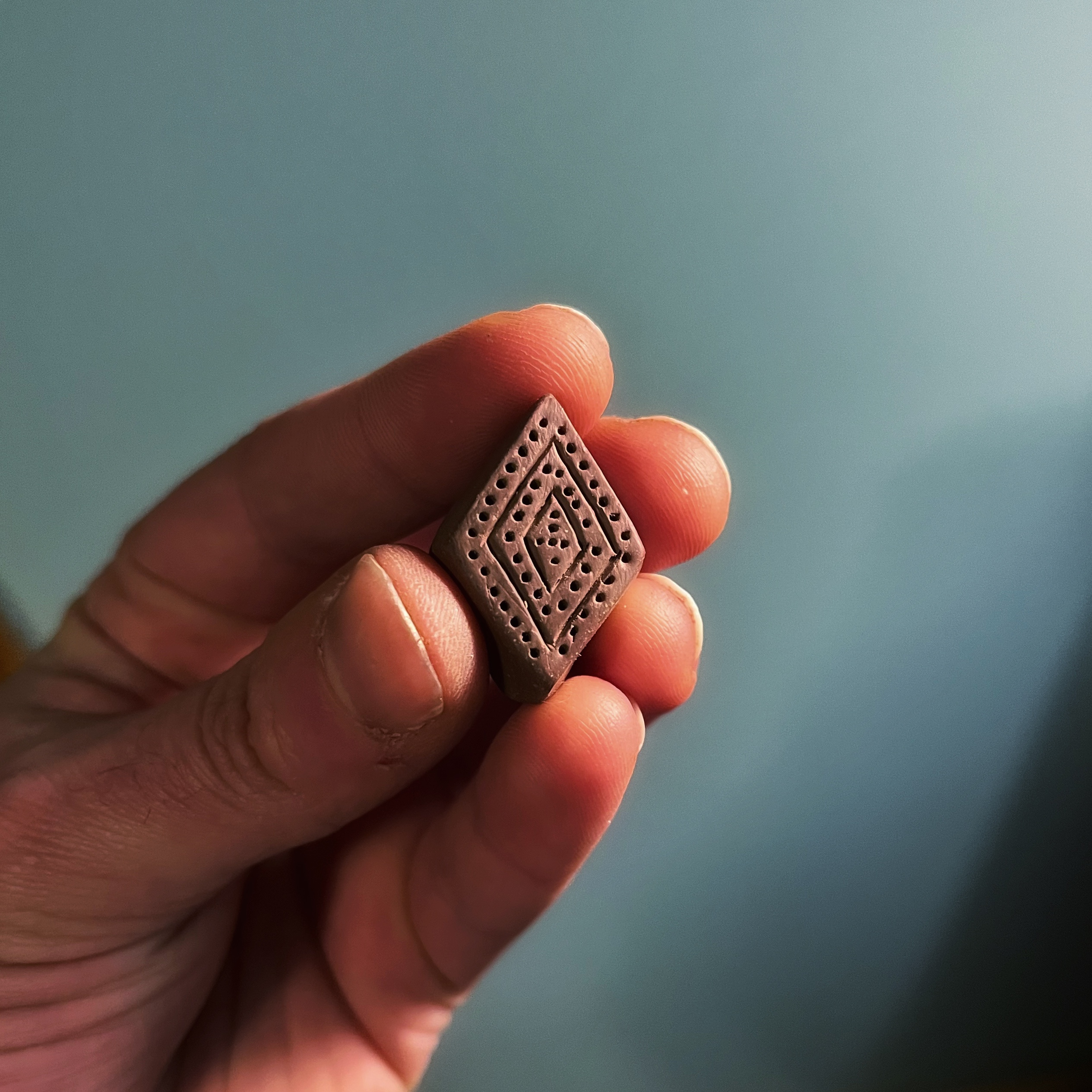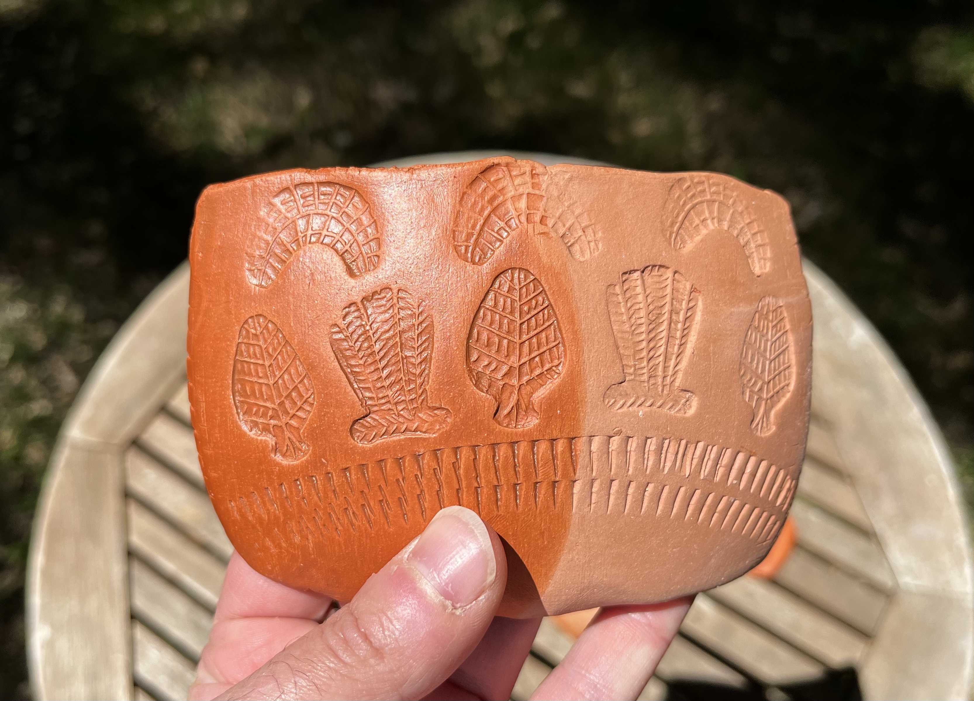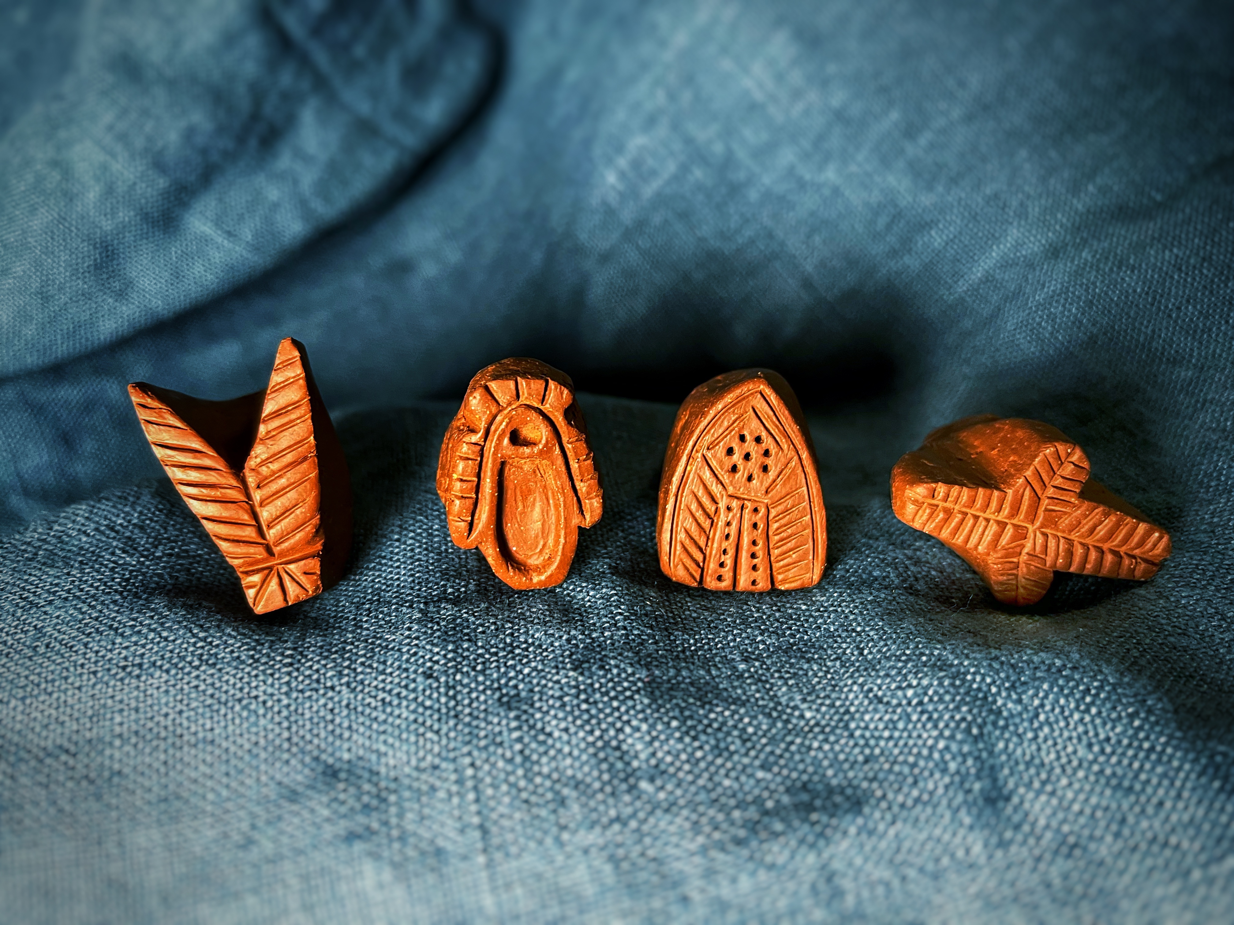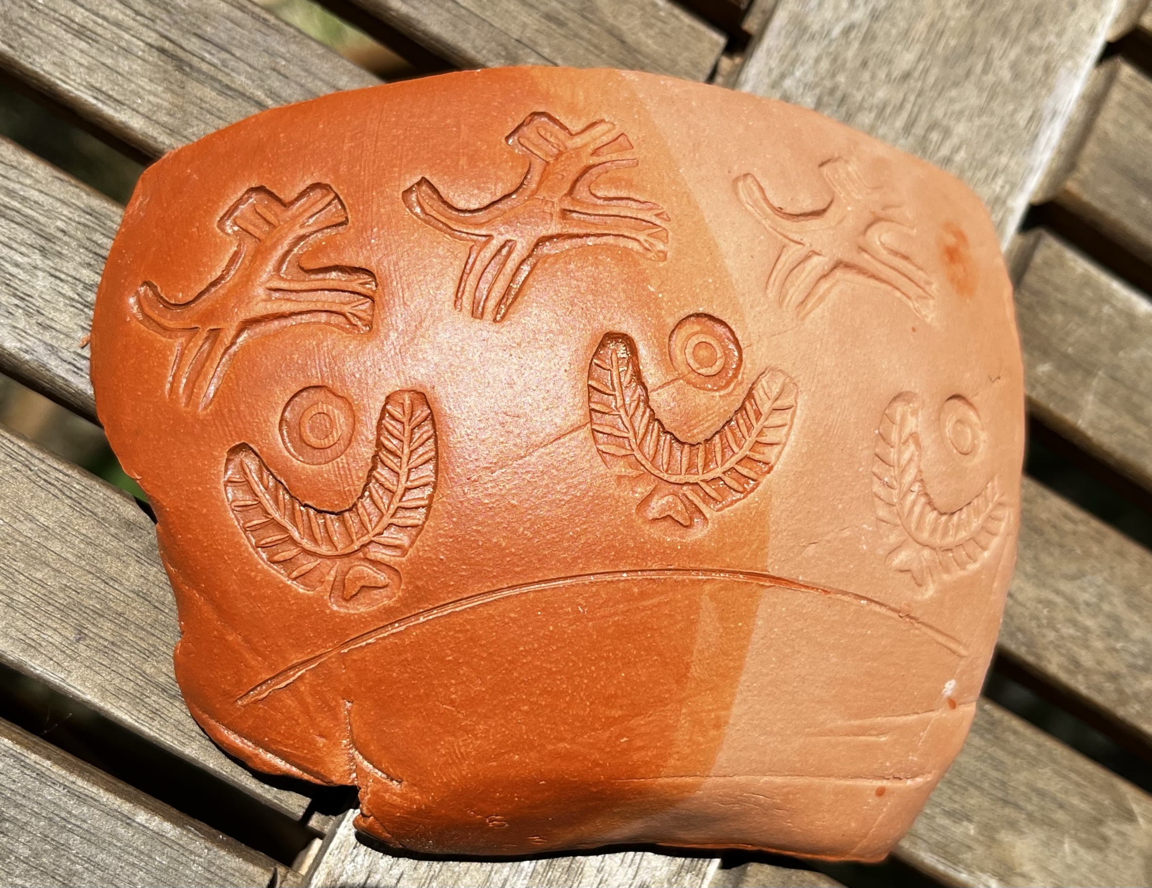 There are multiple surviving examples of the stamp dies themselves (see below). These are generally of unglazed earthenware and have the design carved into one end with a short handle formed at the other end. I make mine by forming the rough shape from wet clay, then waiting for it to partially dry to a “leather-hard” consistency before carving the end into shape with a small knife and using pointed bone and metal tools to cut or impress the details.