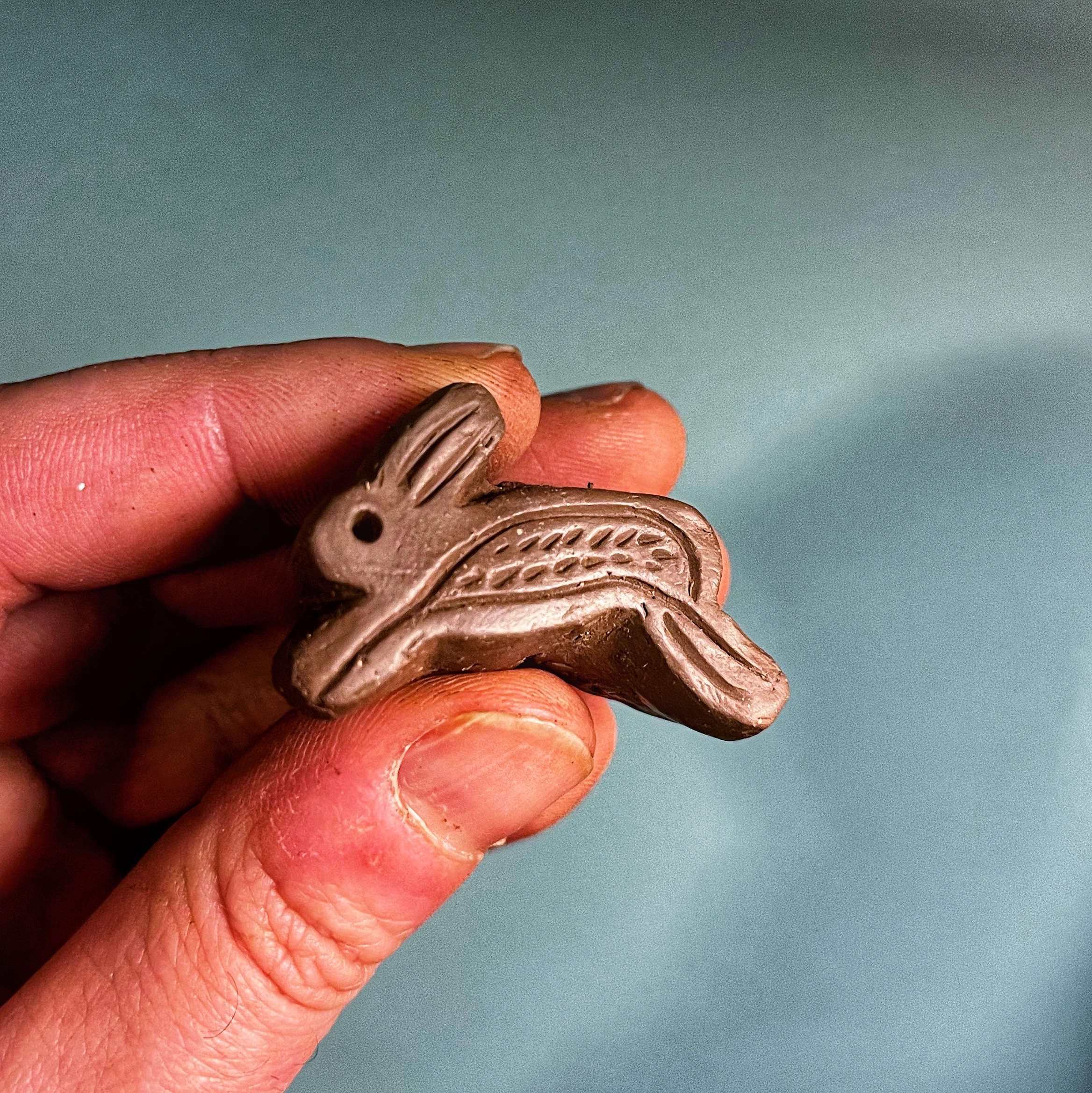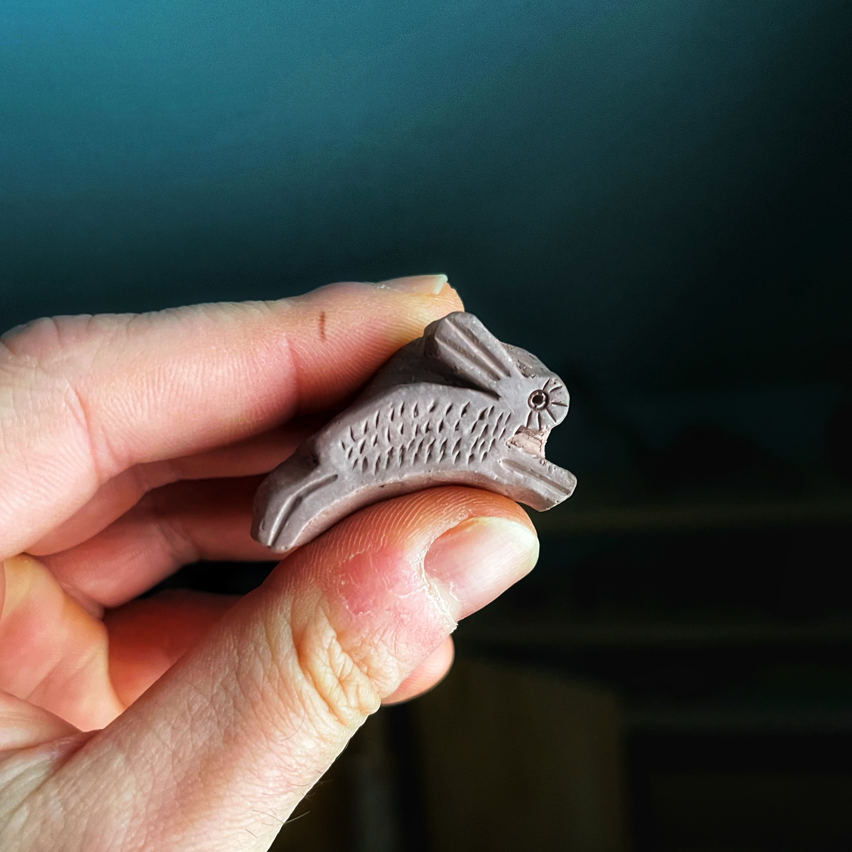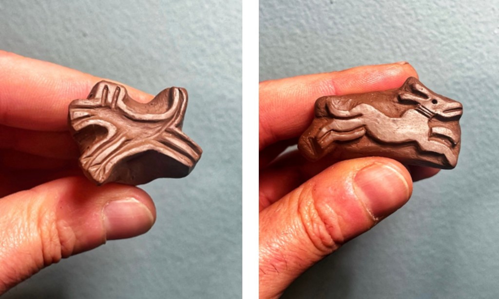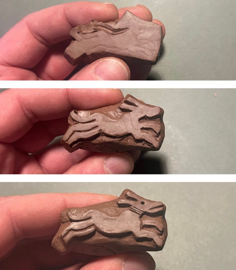 see how much detail would be lost when the impressions were coated. It turned out that the coating “breaks” or thins itself out on sharp edges much like a modern glaze does, so that it only really pooled in larger recessed areas and did not blur the details of the impression like the delicate hatching on the leaves or the rabbit’s fur (see below).