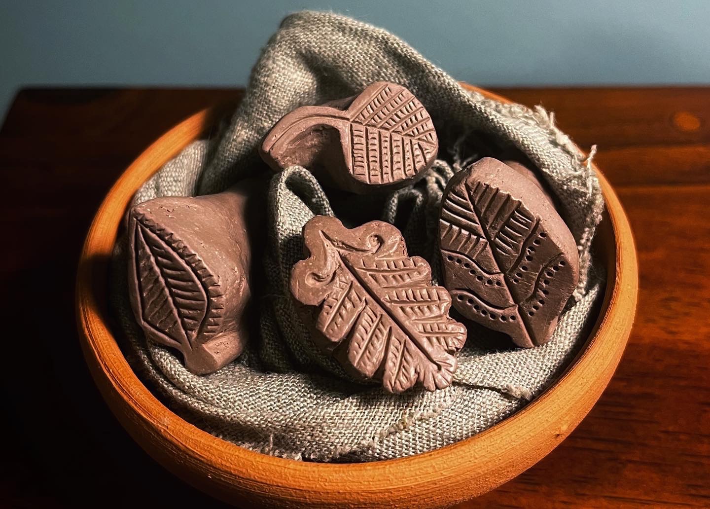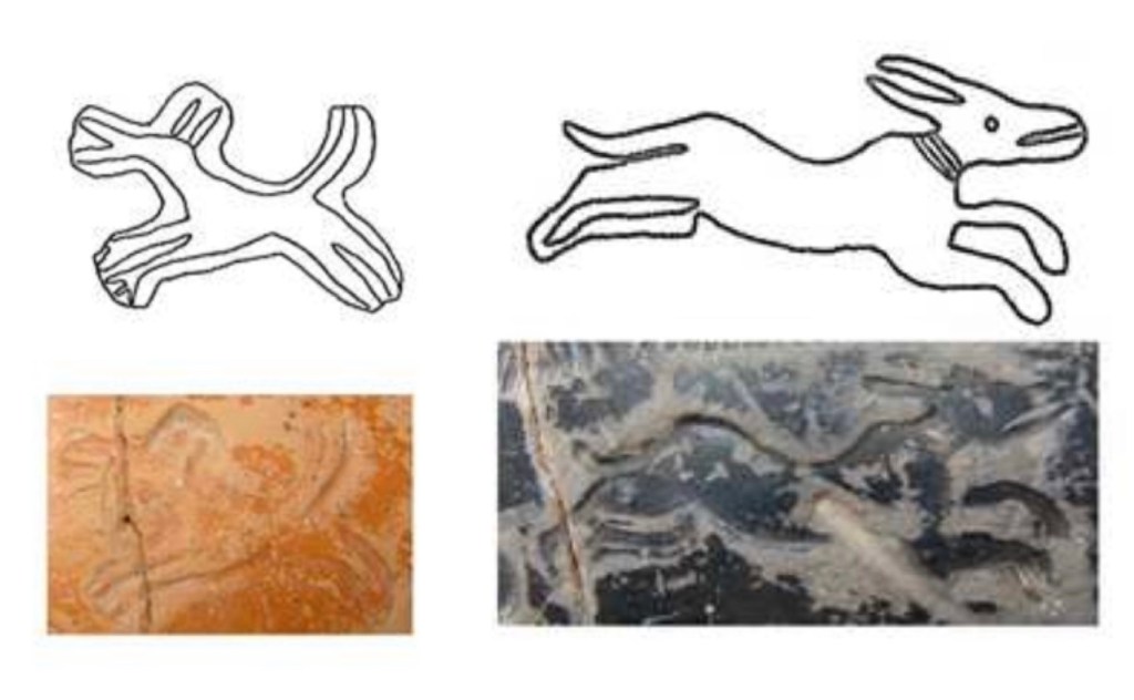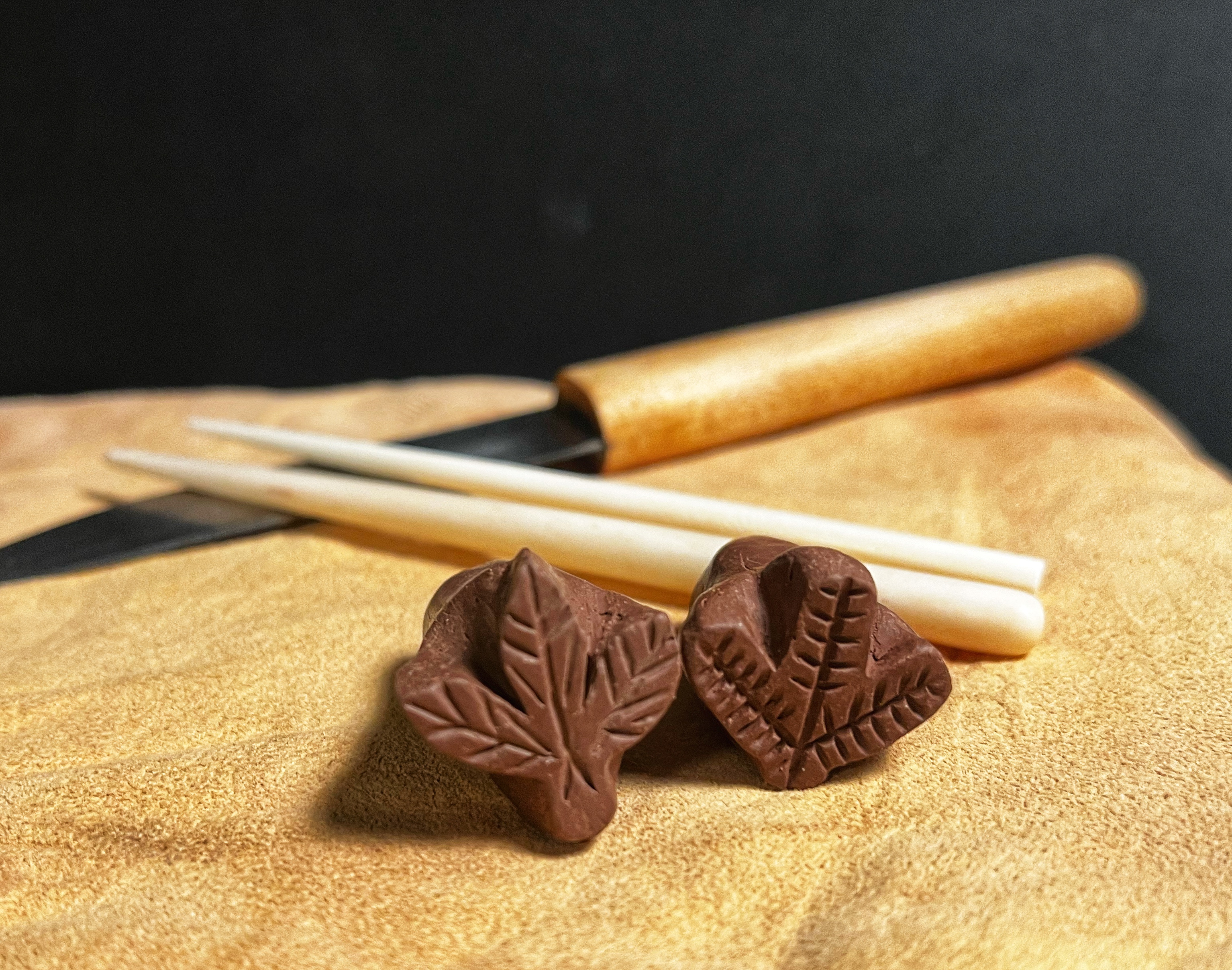 see how much detail would be lost when the impressions were coated. It turned out that the coating “breaks” or thins itself out on sharp edges much like a modern glaze does, so that it only really pooled in larger recessed areas and did not blur the details of the impression like the delicate hatching on the leaves or the rabbit’s fur (see below).