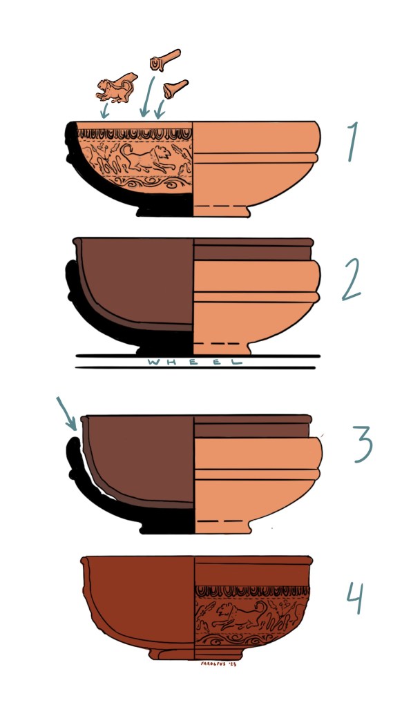 Samian ware is made in a multi-step process that was used in Roman territory by the 1st century BCE (Webster 1996). British potter Graham Taylor has made many replicas of Samian pottery; click here to see his short video that shows the process, or see below for a summary of the steps involved.