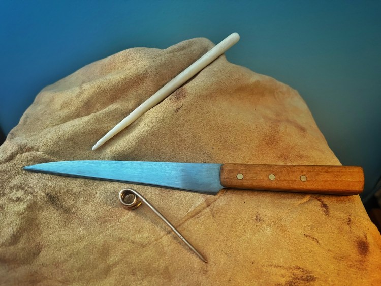 When compared to the finds of various objects from the pottery workshops of Aquincum (based on review of items with digital images in the Hyperion database), some patterns emerge. In the eastern potter’s quarter, finds include several finished vessels, as well as molds and dies used for production, three iron trowels, and three small knives with blade lengths of 16cm, 13cm, and 10cm, all of which have a straight or slightly curved cutting edge. One in particular is startlingly similar in shape to a modern fettling knife, and this shape may be the result of repeated sharpening gradually wearing down a large portion of the blade. I commissioned a reconstruction from a cutler friend; it matches the dimensions of the original and has been extremely handy.