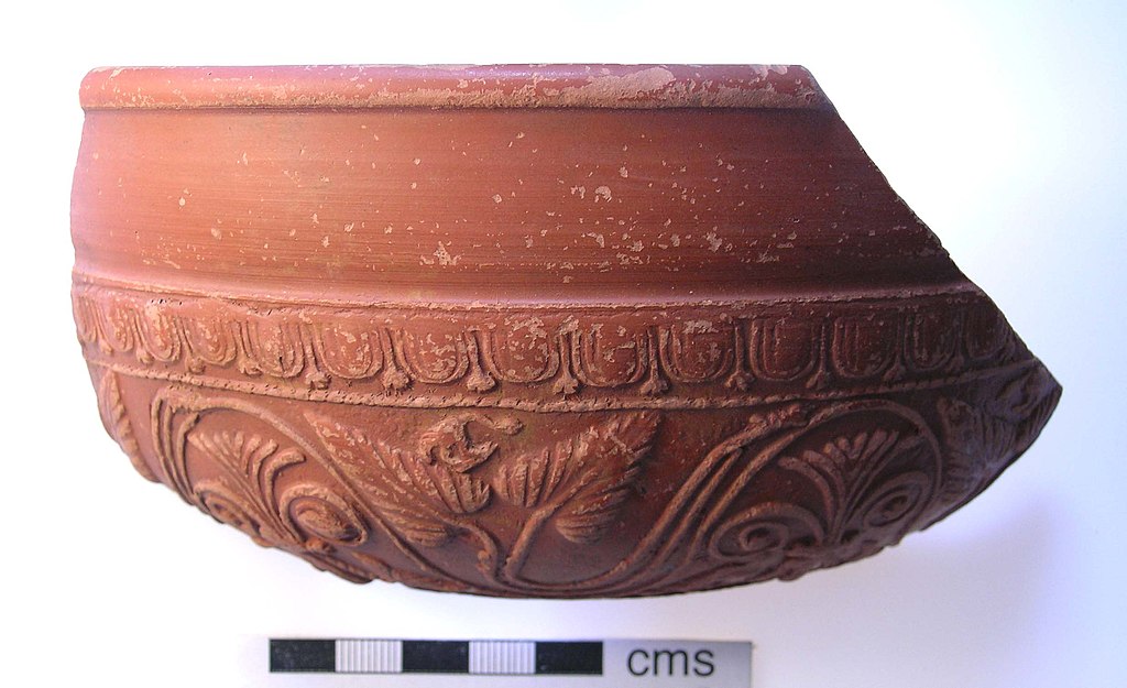 Although this project is focused on Pannonian Slipped Ware, a brief discussion of a different type of Roman pottery known as Samian Ware is important to understand the context. This type of pottery served as the inspiration for the Pannonian wares, but the manufacturing methods are different–Pannonian Slipped Ware uses a direct-stamping method to imitate the look of mold-made imports.