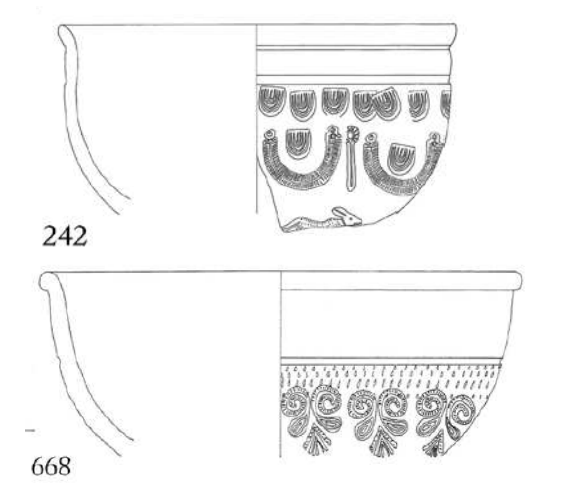 The photograph above shows a Samian ware bowl (courtesy of the Sussex Archaeological Society, CC-2.0). The drawings show Pannonian stamp motifs that are adapted from the Samian designs (drawings from Nagy, 2017).