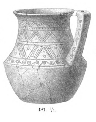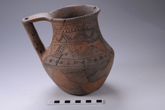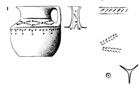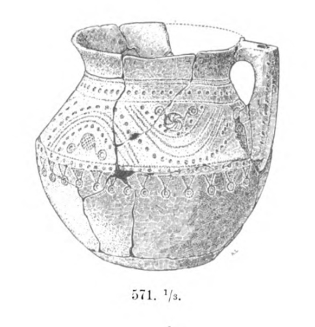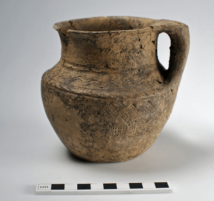 Although styles changed slightly over time and in different regions, the vessels all share the same general shape with a large belly, narrower neck, and an everted (turned outward) rim. Those from eastern Scandinavia have a distinctive form with a sharp bend between the upper and lower halves, known as a “carination.” The handle meets the pot directly on the carination. They are decorated with stamped and incised patterns. The upper half of the vessel is always decorated, and the lower portion and handle frequently are as well .